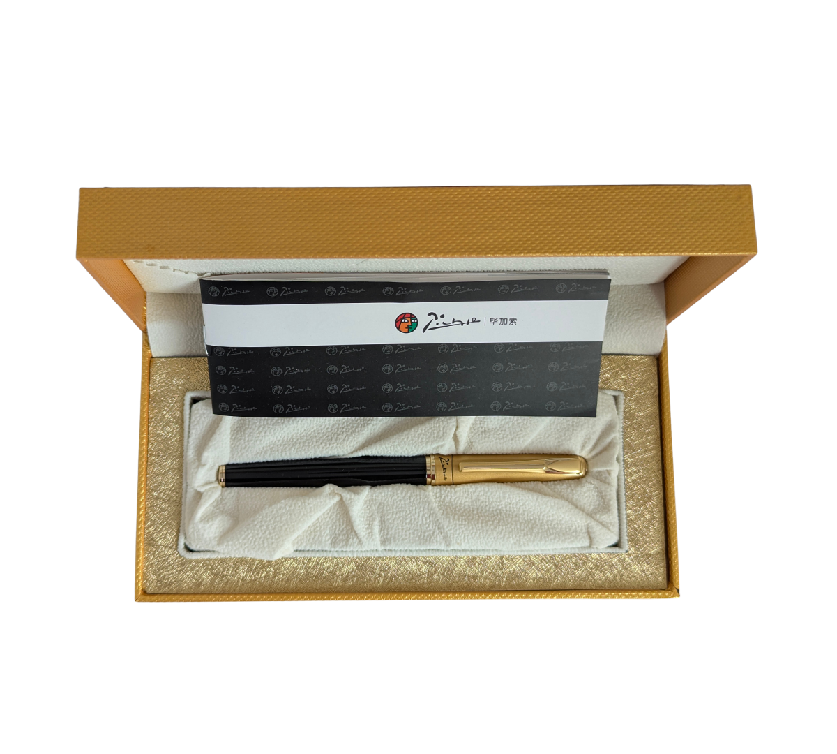Cap: A brushed or polished golden-toned metal cap featuring the distinctive Picasso signature engraved at the base.
